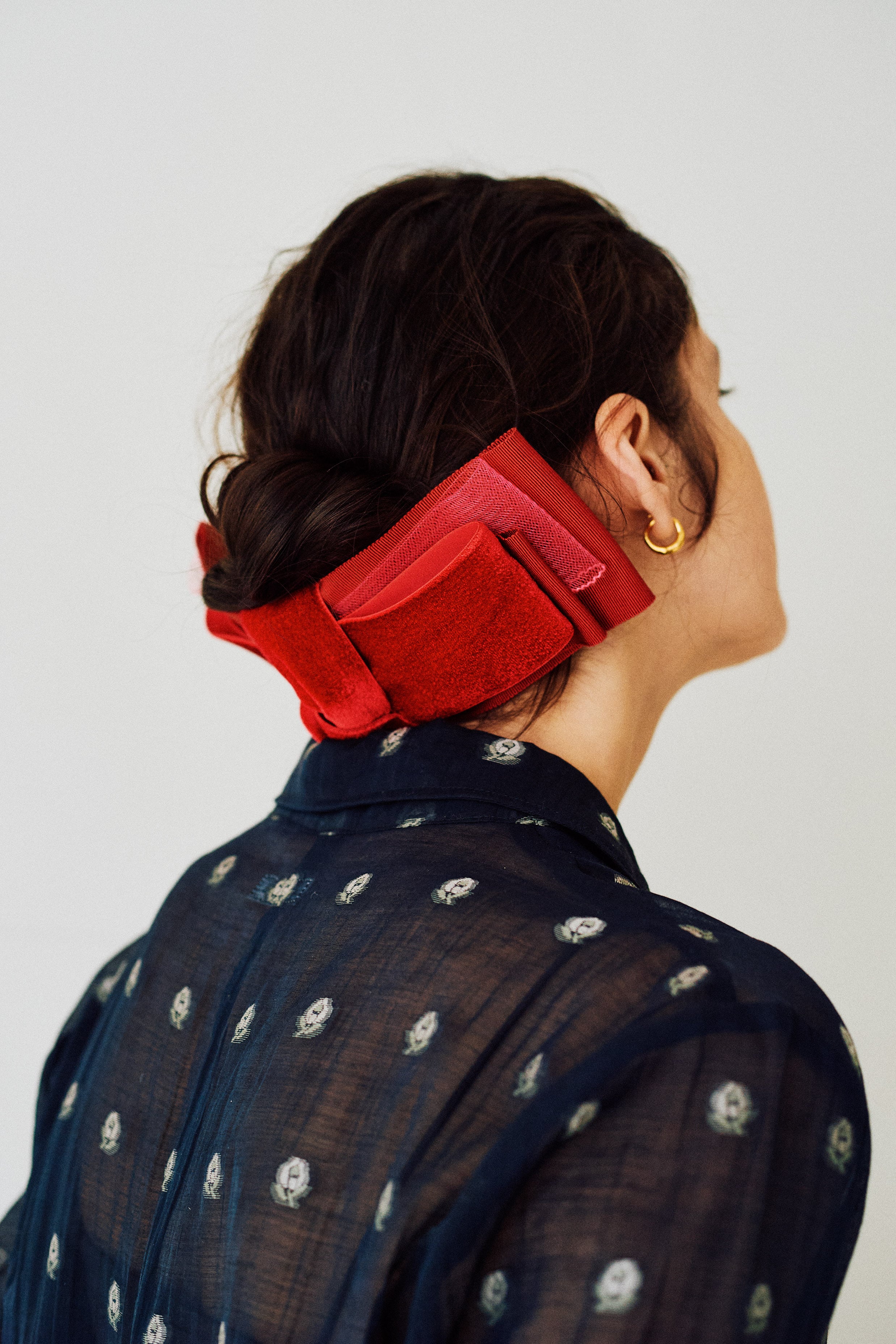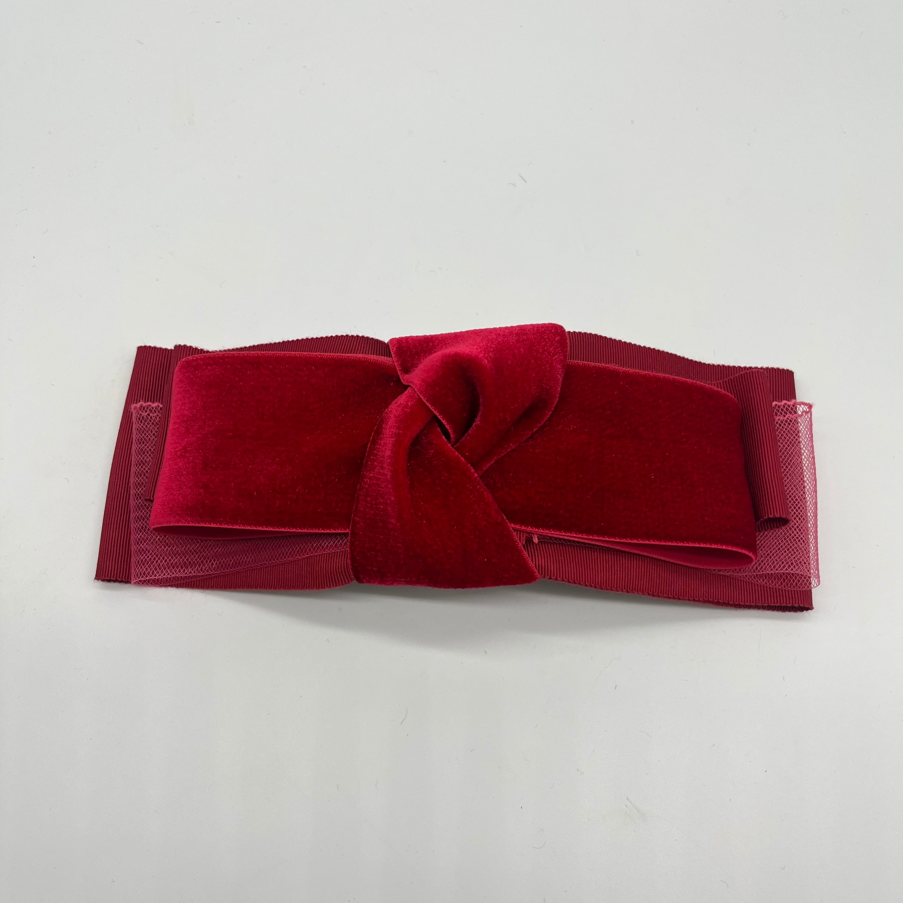 ベルベット、ホースヘア、グログランリボン、3種のマテリアルを使用し華やかな印象です。
