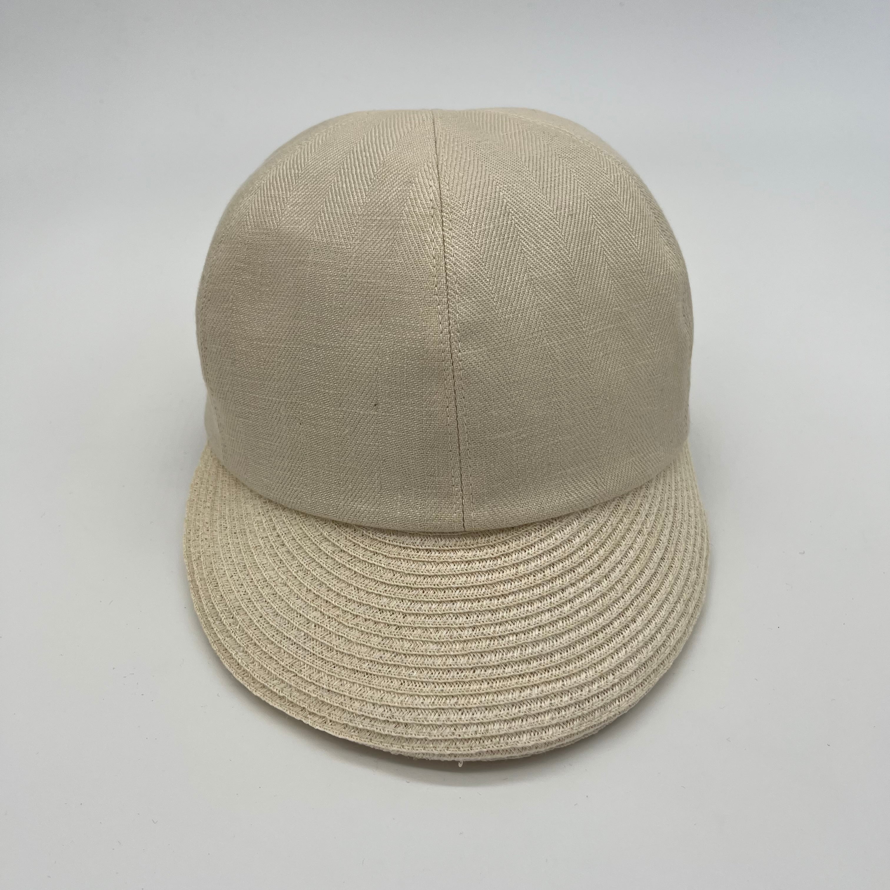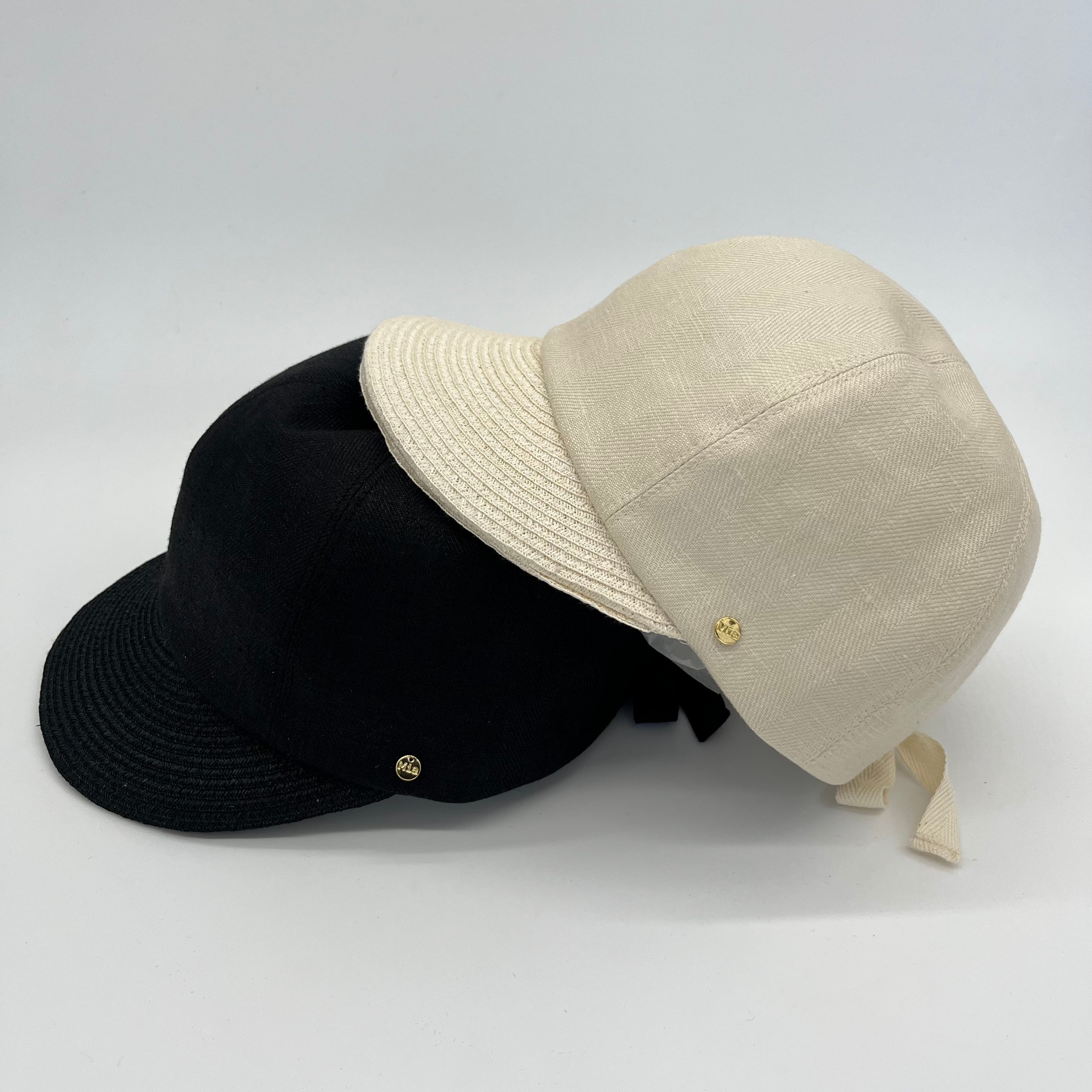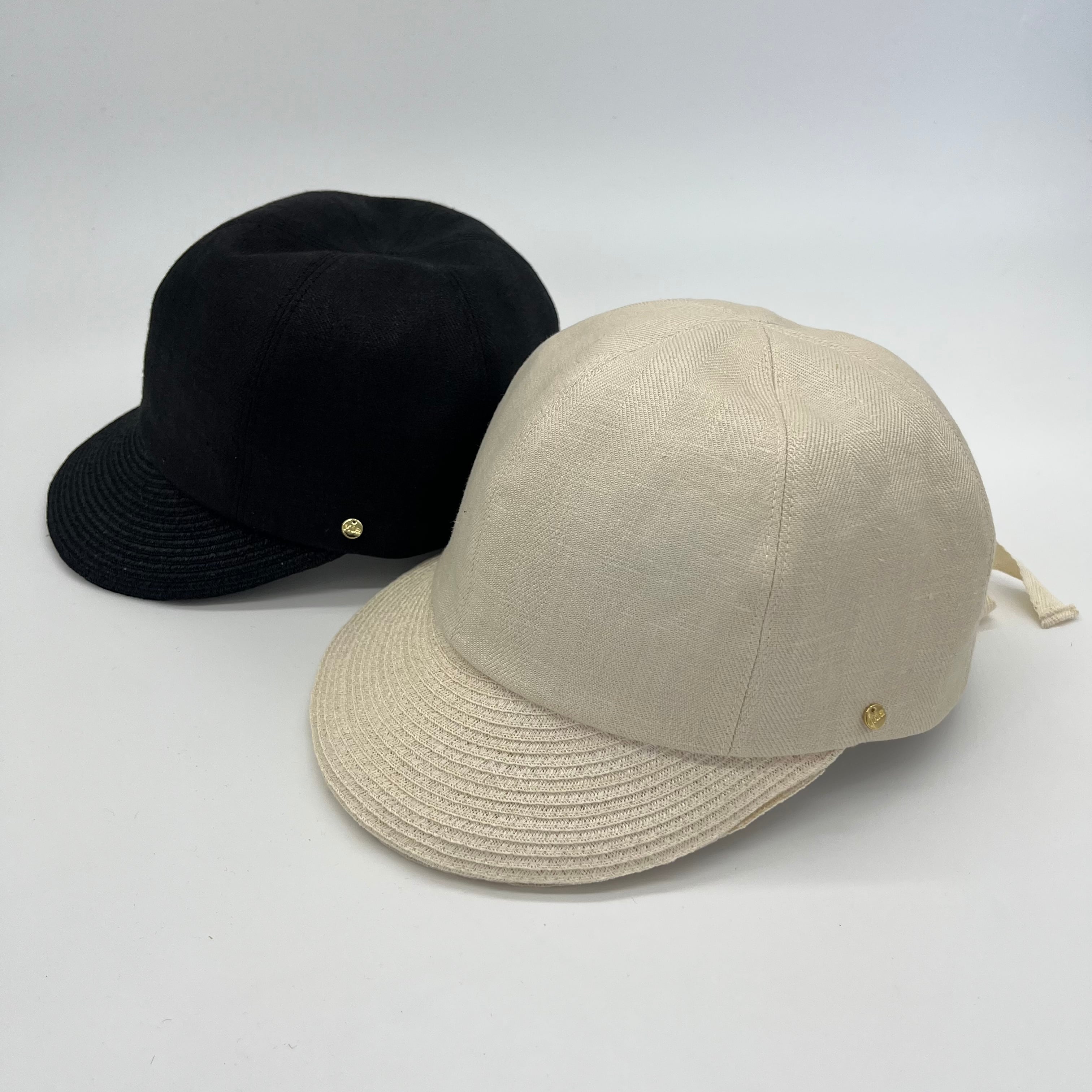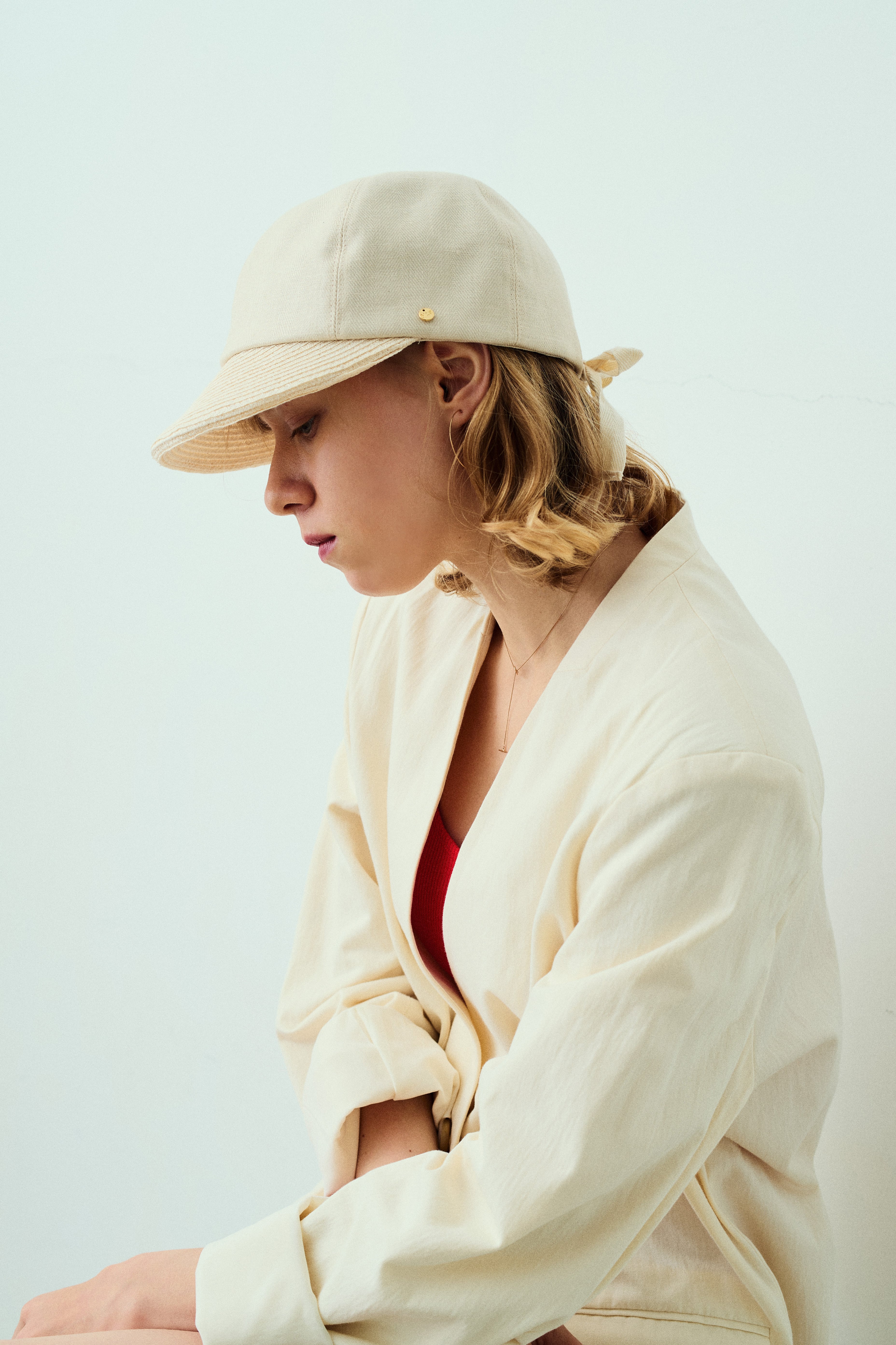 リネンと麻ブレードのブリムを合わせました。スポーティーすぎず、女性らしく被れるキャップを目指しました。
