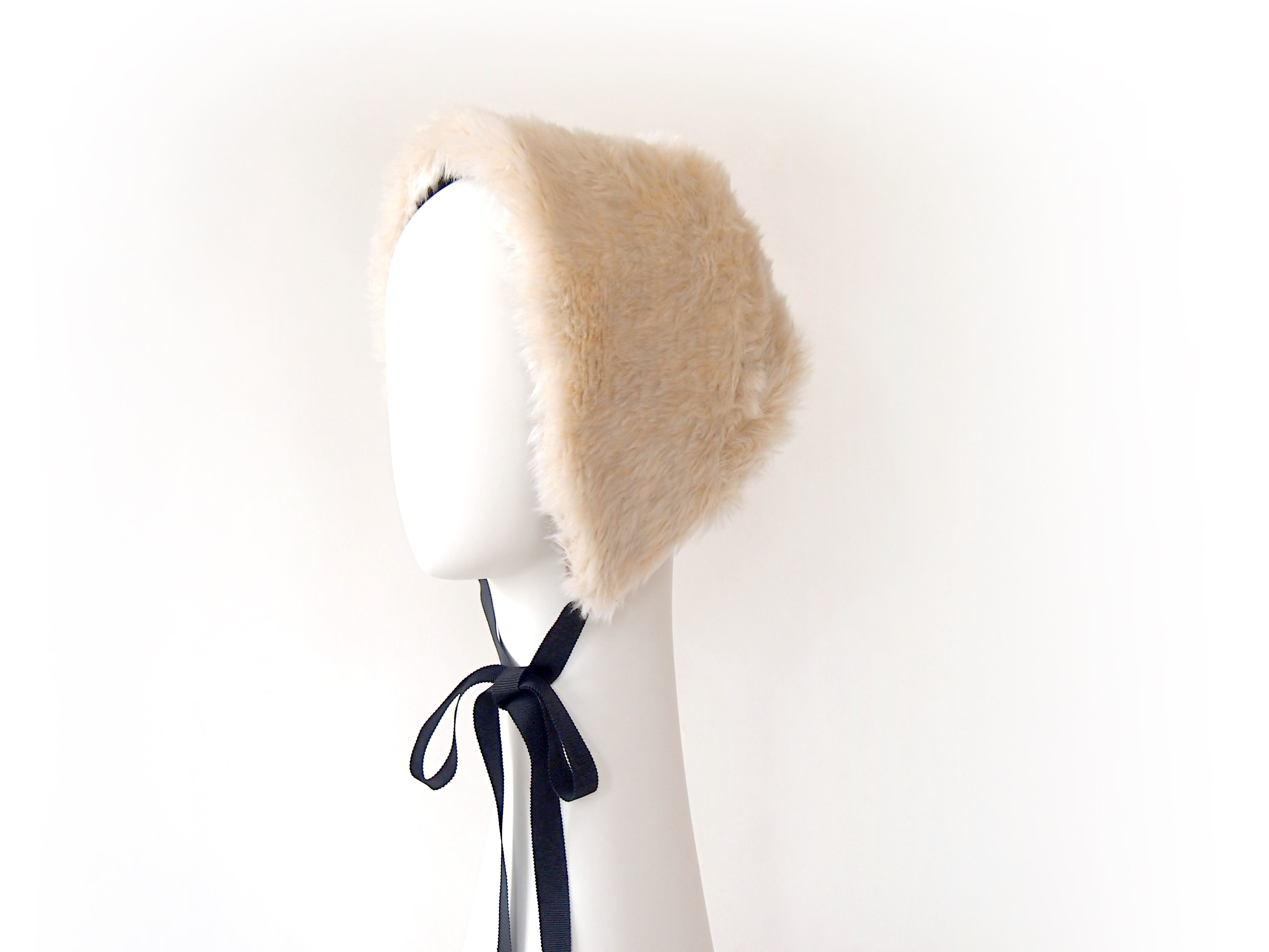 アゴ下できゅっと結ぶグログランのリボンが可愛らしいクラシカルなスタイルのファーフード。