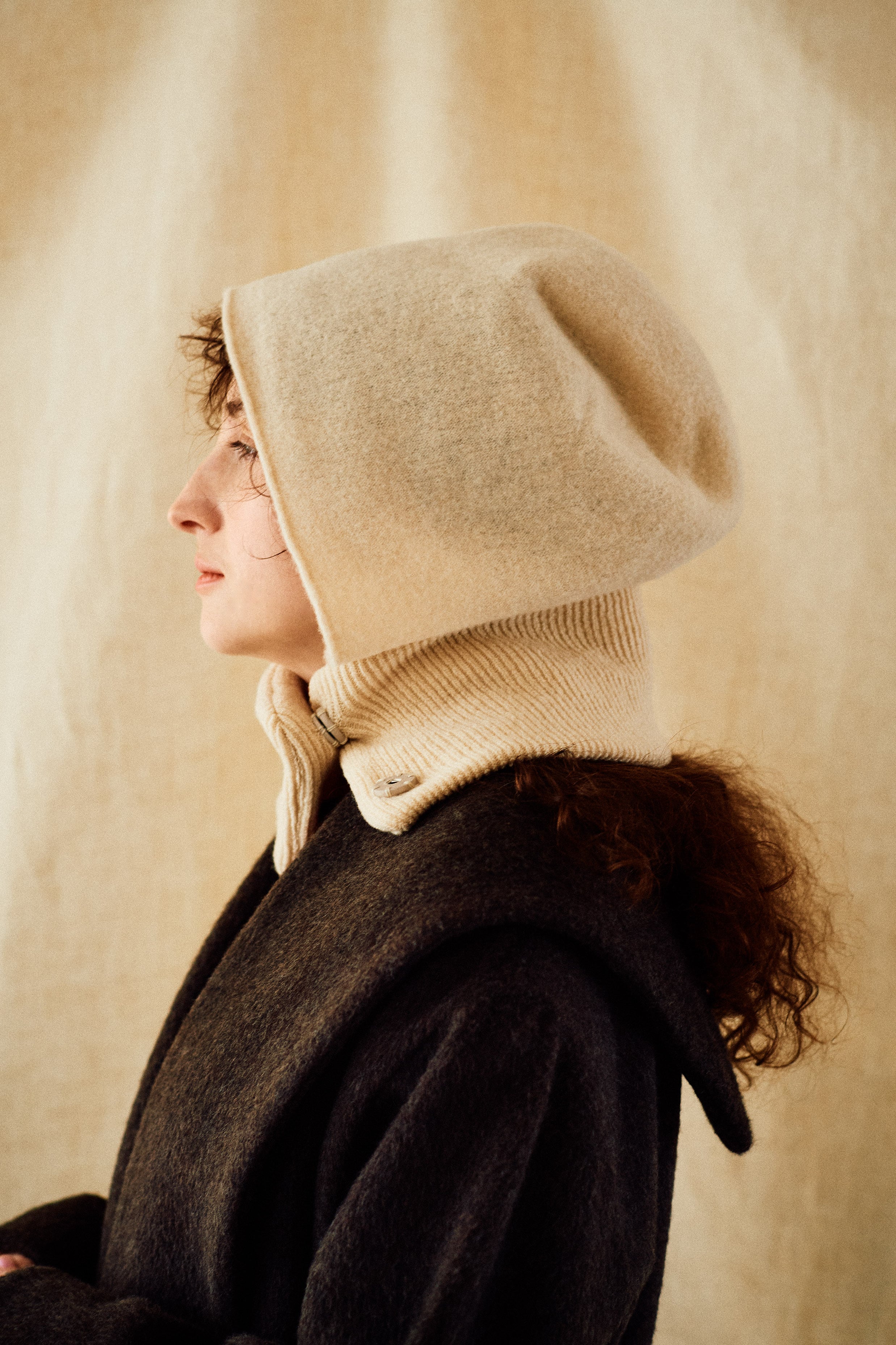 The hood part is made of knitted wool that has been lightly shrunk to a light felt,