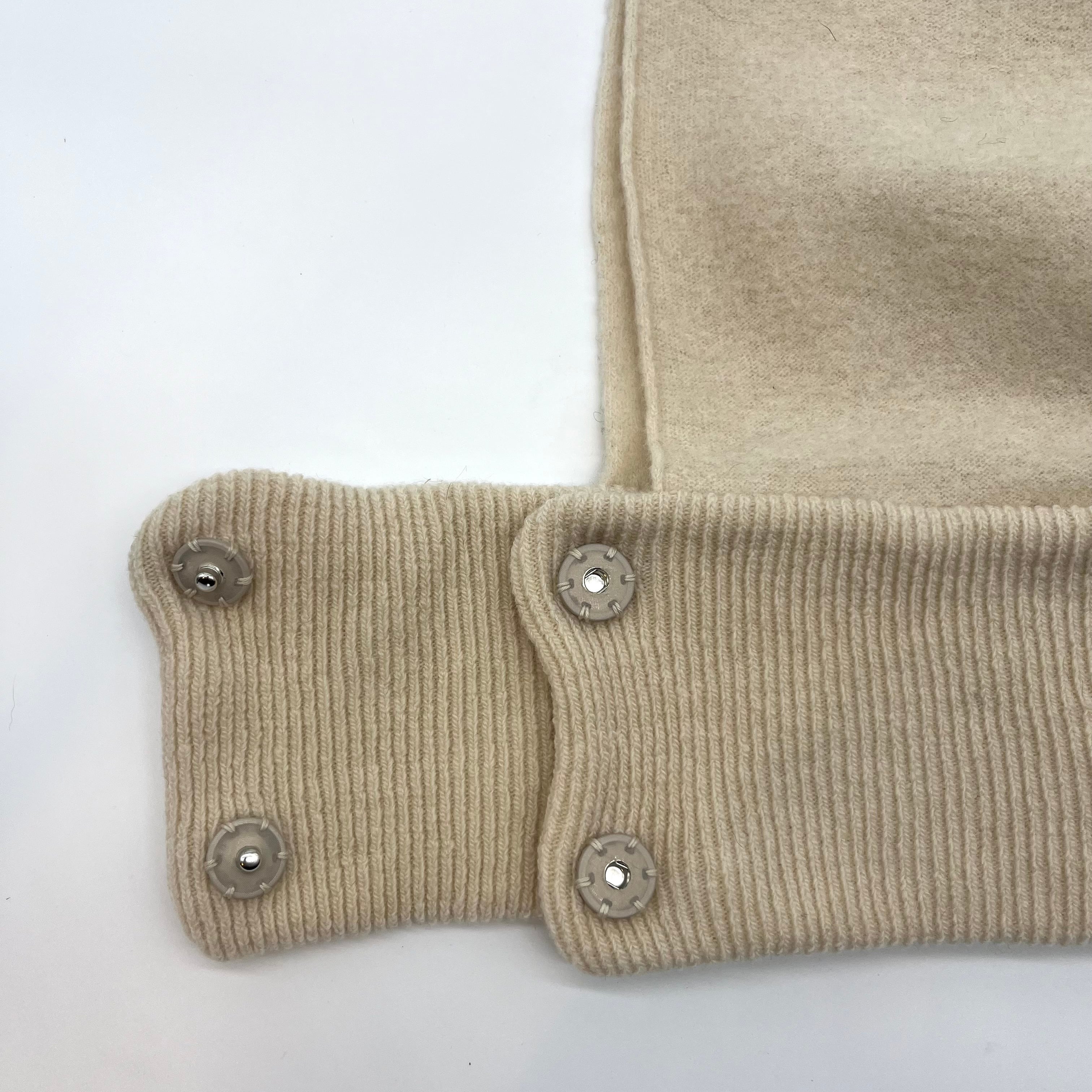 ネック部分に2つボタンが付いているので、一つ留めてアシンメトリーに身につけたり、フードも降ろしたりかぶったり、色々アレンジしていただけます。